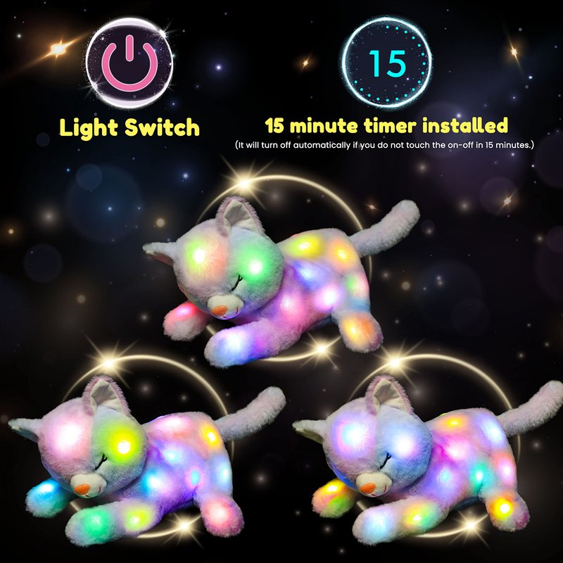 - COLORFUL CHANGING LIGHTS & AUTOMATIC TURN OFF: This plush cat features of glowing in the dark and the light will change multiple colors every few seconds. Additionally, we installed a 15 minute timer inside which will turn off automatically if you do not touch the on-off in 15 minutes. While, you can still turn it off as you like by pressing the switch again.