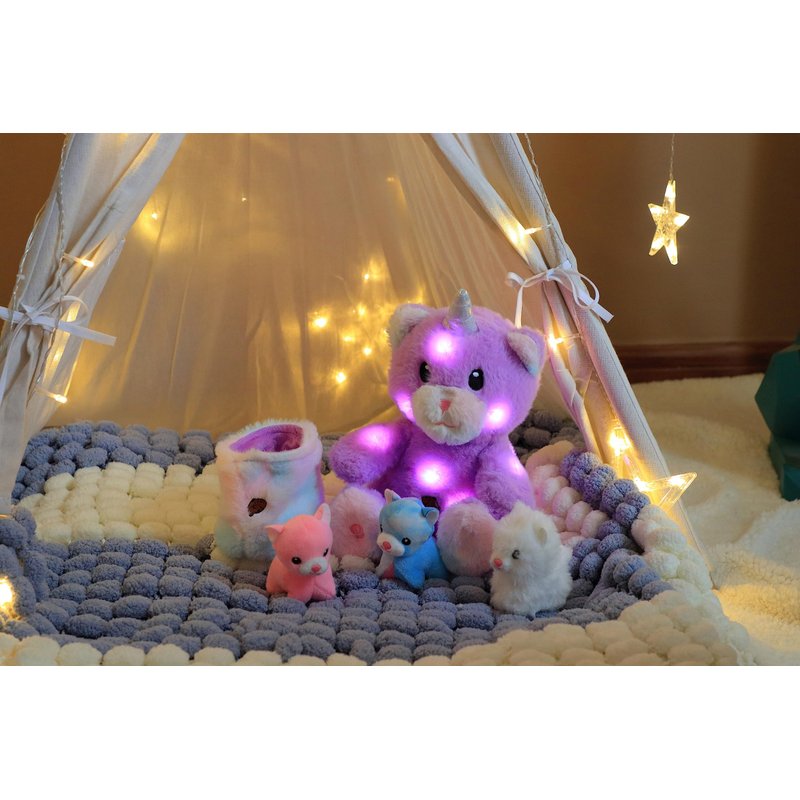 - FOUR CATS IN ONE SET: The light up stuffed mommy cat comes with a surprise in her bucket, 3 baby kittens that can be taken out from it. And the bucket is magnetic, a tiny fish was embroidered on the cat's belly and the body of the bucket, under it is a magnet, through the magnets, you can remove them or close them together easily. The Mommy cat comes with purple plush, 3 baby kittens have different colors, they are rainbow pink, white, blue respectively.