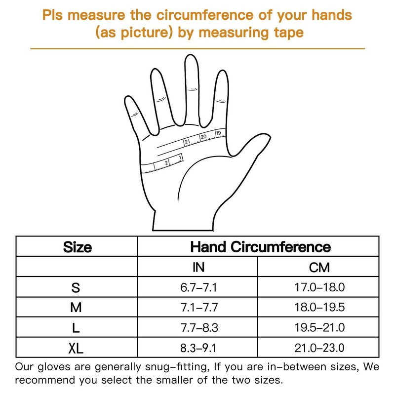 Please measure the circumference of yourhands (as picture) by measuring tape and compare with the chart to know thesize of your gloves