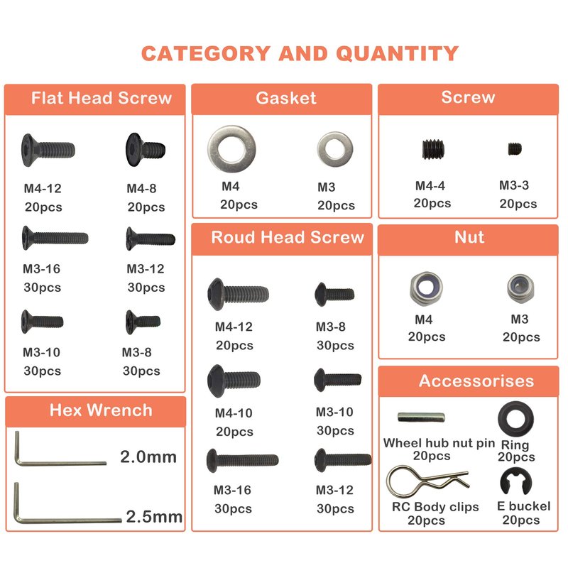 - 【Package Content】: M3 & M4 screws (flat head & round head), M3 & M4 nuts and gaskets, 2x10mm wheel hub nut pins, O ring, M2.5 E buckle and rc body clips, 522pcs totally