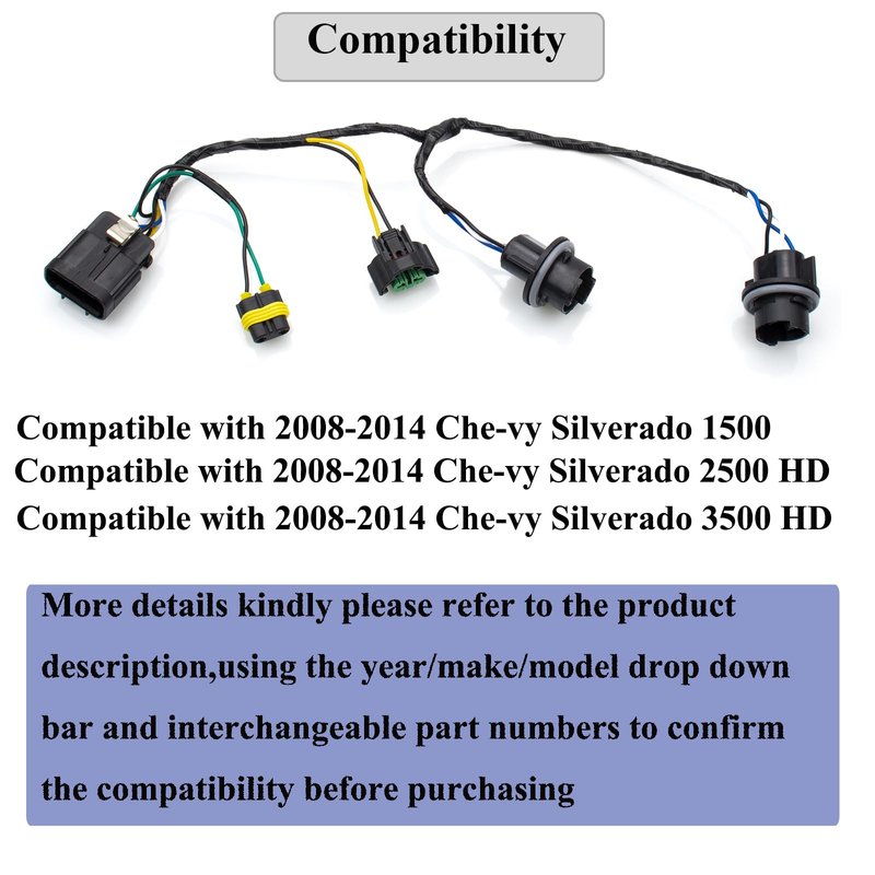- Wiring harness assembly with two lamp sockets and three connectors. Kindly please check the description or use the amazon year/make/model drop down bar and interchangeable part numbers to confirm the compatibility before purchasing.