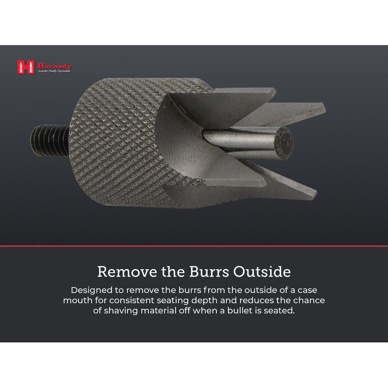 - Remove the Burrs Outside - Designed to remove the burrs from the outside of a case mouth for consistent seating depth and reduces the chance of shaving material off when a bullet is seated