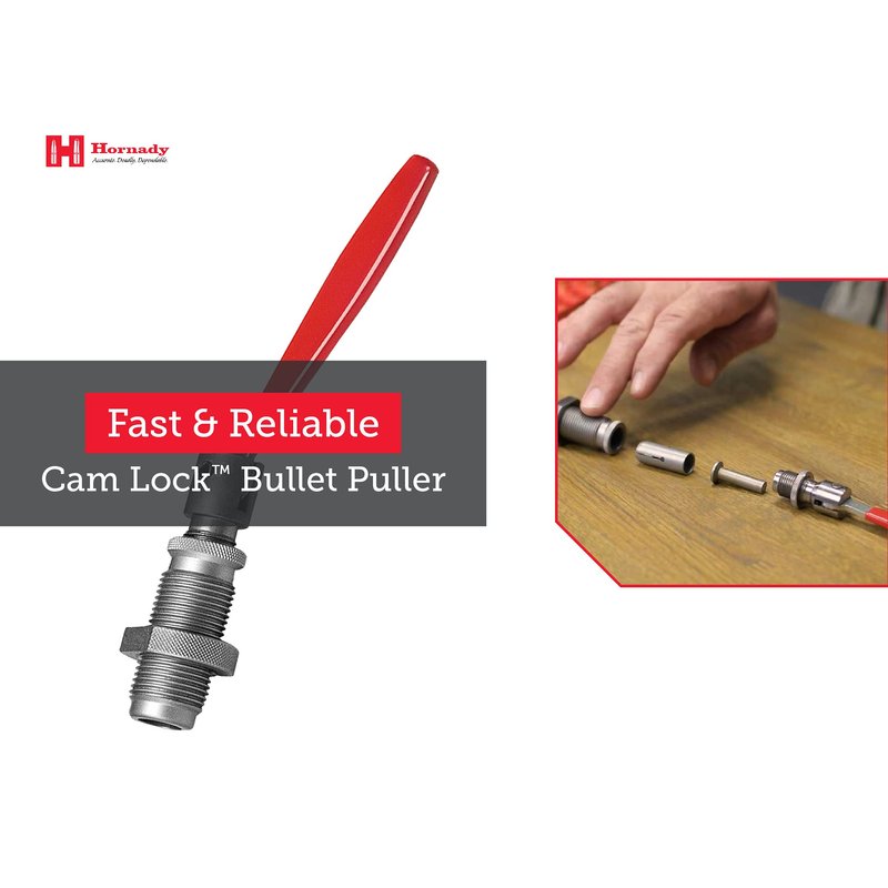 - Great Tool for Reloaders - keep this Hornady Cam Lock Bullet Puller 050095 handy for a fast and easy way to pull bullets with your press. Mounts to any press with standard 7/8 -14-inch threads and uses Hornady Collet Only (sold separately). Not for use with cast bullets