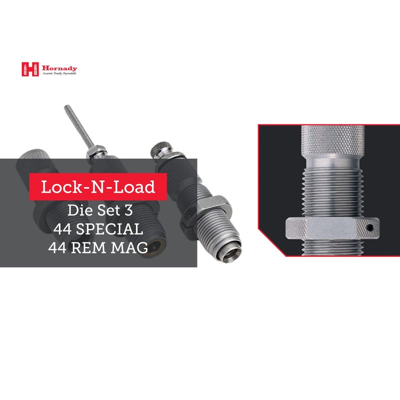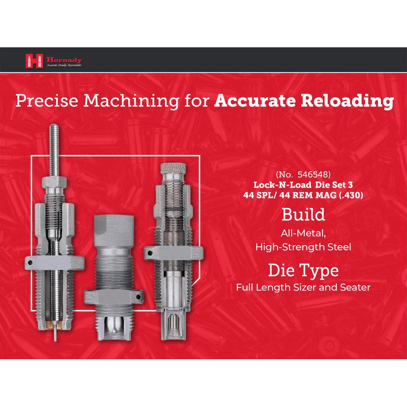 - Die Set for the Avid Reloader - hand crafted and polished for an unmatched finish, the Hornady Custom Grade New Dimension 3-Die Set 44 SPL/44 REM MAG(.430) (546548) is necessary for each cartridge that you reload to decap, de-prime, resize, and seat/crimp the bullet