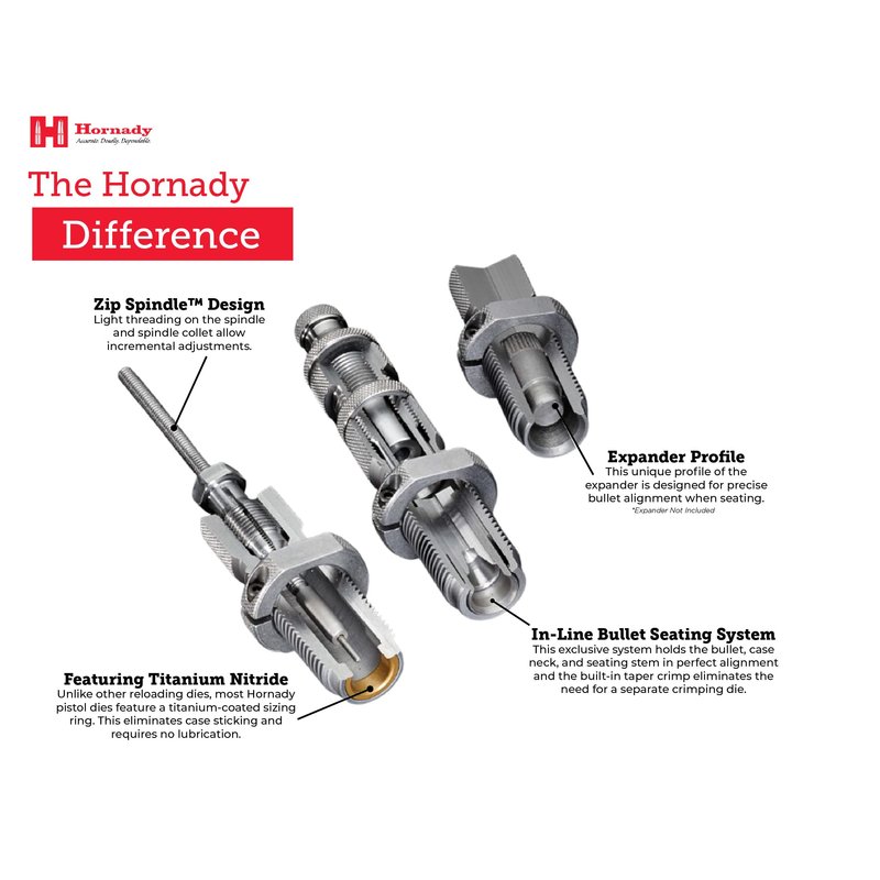 - Precise Machining for Accurate Reloading - Hornady reloading dies are designed for a true match to your chamber. Keep several appropriate Hornady die sets for each caliber size at your reloading bench. Includes a full length sizer die, seating die, plastic storage box, three Sure-Loc rings, elliptical expander, and headed decapping pins