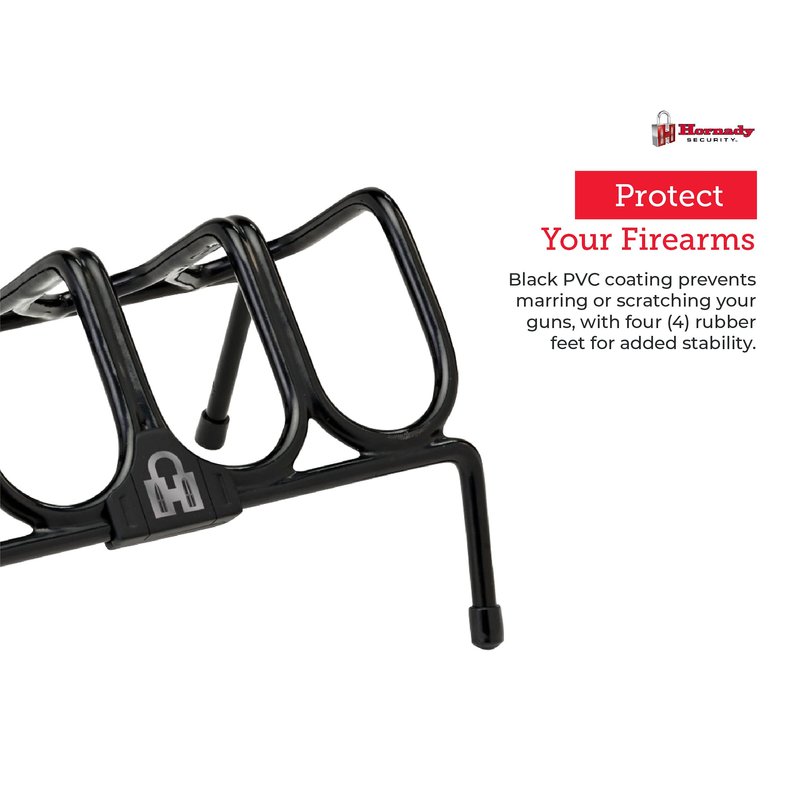 - Heavy Duty – This sturdy handgun rack has a PVC coating which prevents scratching or damage to your handguns. Featuring 4 rubberized feet, it won't slip or slide in your gun safe or on a workbench