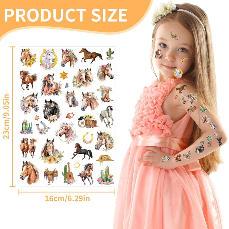 - Easy to Use: Each tattoo sheet measures 9" x 6.3"; simply place the tattoo on your skin, dab with a wet tissue, and peel away the film to reveal your enchanting horse-themed design