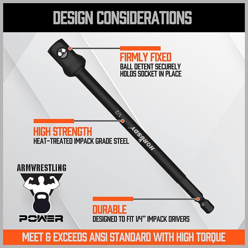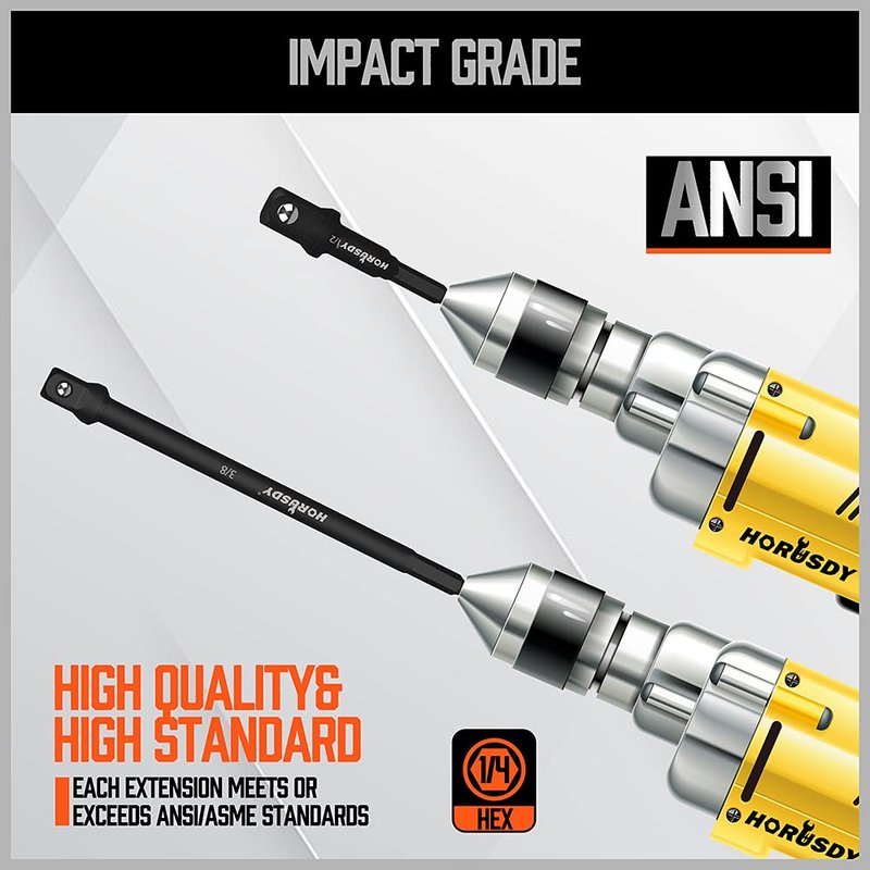 - 1/4" hex shank for all quick change drill chucks with three 3-inch-long socket adapters and three 6-inch-long socket adapters in 1/4" drives, 3/8" drives, and 1/2" drives. The perfect size makes it compatible with all brands of electric drill and screwdriver handle tools.