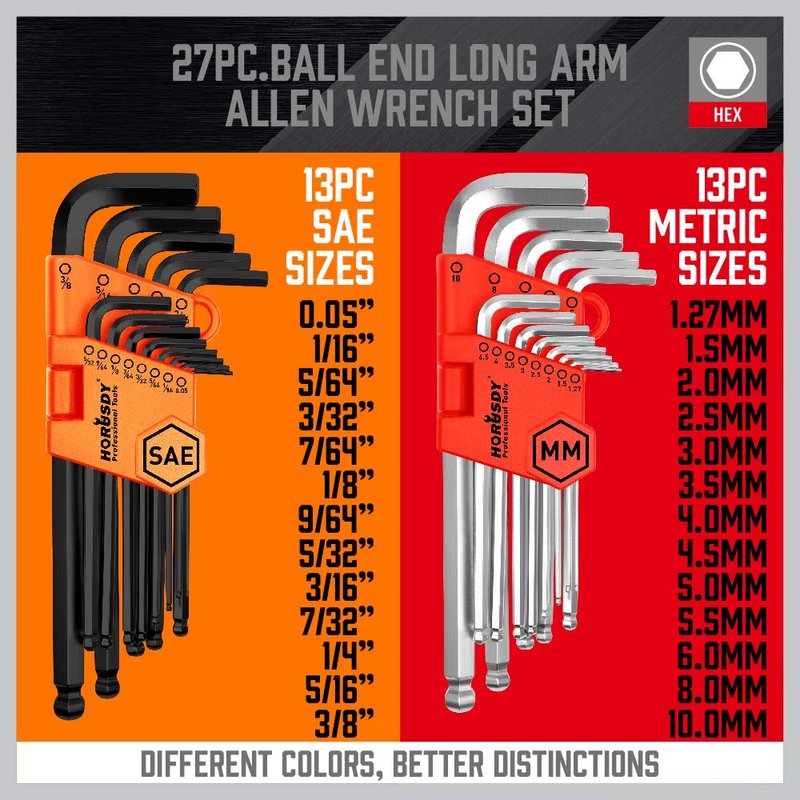 It features the most common metric hex wrench sizes for cars and trucks, machinery, bikes, lawn equipment, appliances, and furniture.