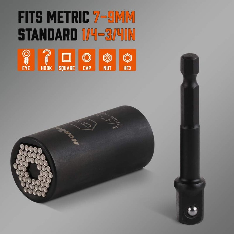 - From standard 1/4 inch to 3/4 inch, metric 7 mm to 19 mm, the torque exceeds 125 pounds. This uniquely designed universal socket kit can be automatically adjusted to any size or shape, durable, compact, and easy to carry. It is very suitable for car repair, home maintenance, garden decoration, manufacturing, and construction.