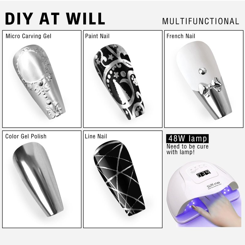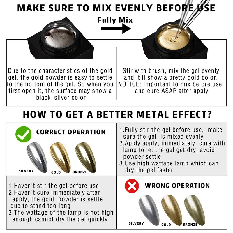 - 【Warm Tips】Mirror Metallic Nail Polish needs to be cured with a 48w or higher power UV/LED for 120-180 seconds. Due to the characteristics of gold metallic nail polish, it must be cured immediately after application. Metallic Nail Gel is thicker and tends to sink over time, so please stir well before use. If you have any questions about this product, please feel free to contact us.