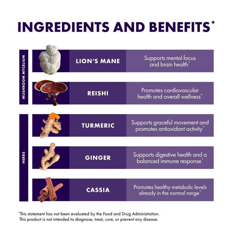 - Herbal Supplement with Mushroom Mycelium: Our brain support supplement is formulated with Lion's Mane, "The Smart Mushroom," and Reishi mushroom