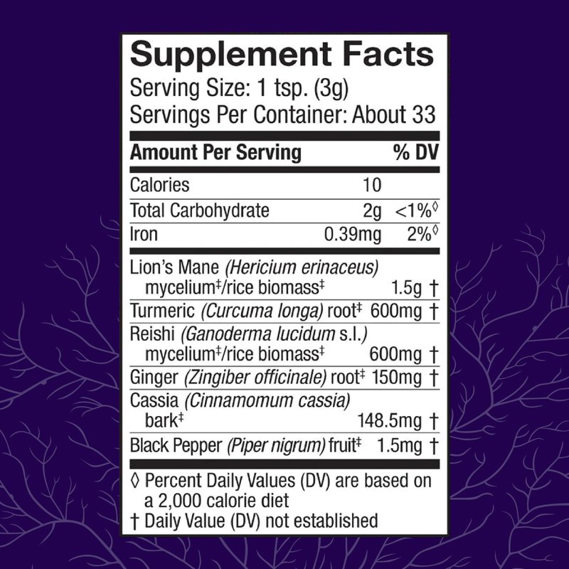 Explore the numerous health benefits of organic mushrooms and herbs with Host Defense MycoBotanicals Brain & Body* Powder. Each vegan powder serving supports focus and brain health with organic mushroom mycelium and herbs. Our carefully crafted blend of Lion's Mane and Reishi mushroom supports both brain health and heart health. Lion's Mane, "The Smart Mushroom," has been revered for centuries, and now you can experience the support it offers for brain health, clarity and focus. The addition of Reishi, known for its heart health benefits, adds additional support for overall wellness. This herbal mushroom supplement also includes Turmeric, Ginger, and Cassia to support whole-body health and Black Pepper to support absorption.* For daily brain and whole-body wellness support, take one teaspoon of this powder mushroom supplement once daily, with food or on an empty stomach, or as recommended by your healthcare advisor.* Powered by organic mushroom mycelium and herbs, Host Defense MycoBotanicals products don't contain any fillers and are third-party tested for quality and safety. Fungi Perfecti, makers of Host Defense Mushrooms, is a family owned company founded in 1980 by renowned mycologist Paul Stamets with the goal of building the connection between health and beneficial fungi. Our certified organic mushroom mycelium and fruit bodies are grown at our farm near the Olympic Rainforest in Washington State and are sustainably cultivated from responsibly cultured wild strains.* Our mycelium-based mushroom products are non-GMO, gluten-free, and vegan. We are a certified B Corporation and we use eco-conscious packaging that aligns without 110% Climate Positive Commitment. Our continued mission is to explore, study, preserve, and spread knowledge about the use of fungi to help bees, trees, people, and the planet.*