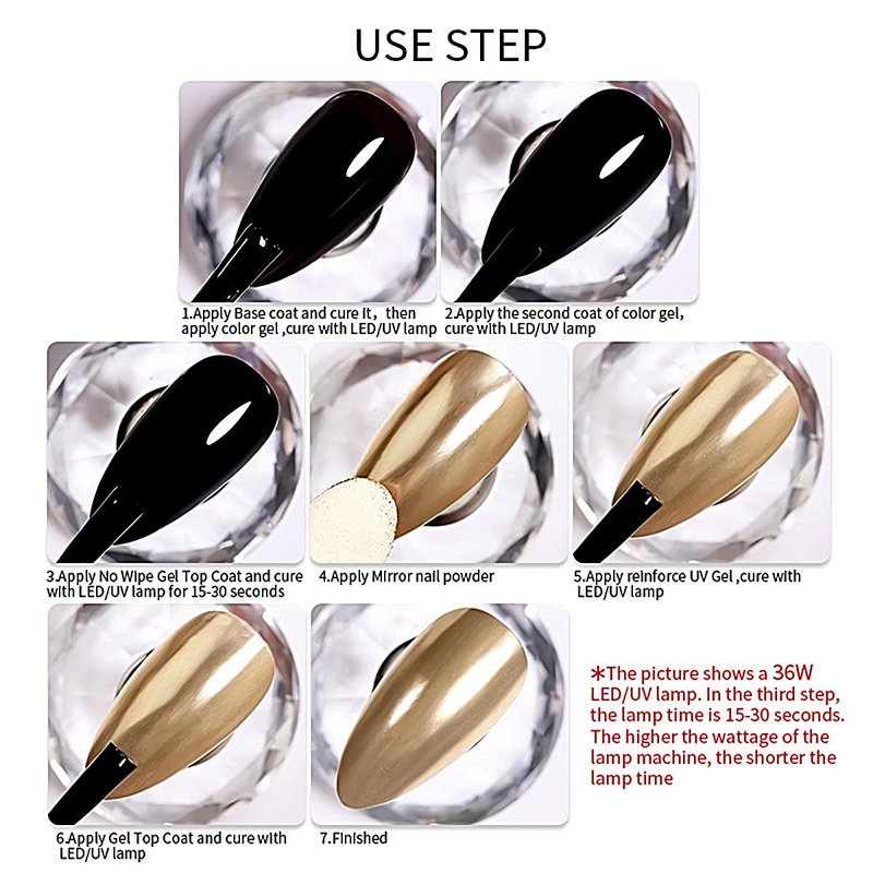 Be sure to apply the magic mirror powder in the slightly sticky state of the top coat. This is very important.