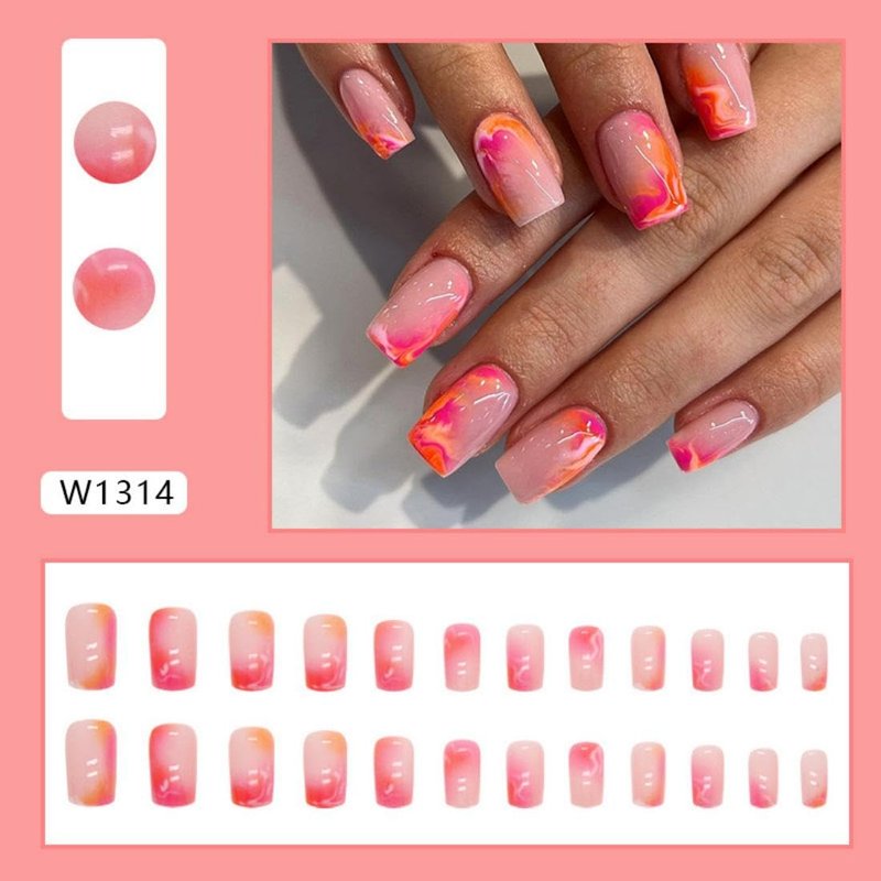 Hot Pink Press on Nails Medium Square Fake Nails Marble False Nails with Design Orange Gradient Stick on Nails Ombre Glue on Nails Reusable Acrylic Nails for Women Girls Manicure 24pcs