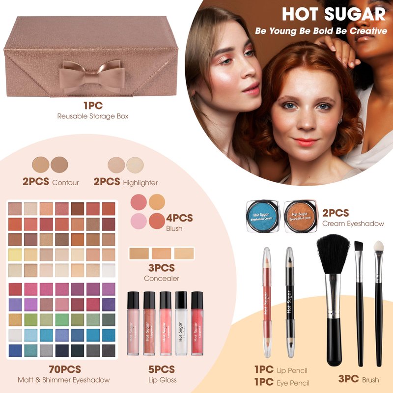 - All-In-One Basic Kit: This teen girls makeup box contains everything needed for a complete makeup routine. The kit includes: 70pcs matte & shimmer eyeshadow, 5pcs lip gloss, 4pcs blush, 2pcs highlighter, 2pcs contour, 3pcs concealer, 2pcs eyeshadow cream, 1pc lip pencil, 1pc eye pencil, 3pcs brush and 1pc reusable storage box.