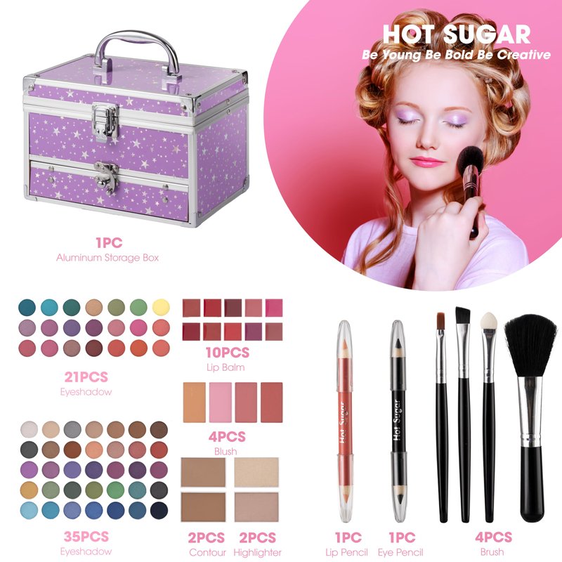 - WHAT YOU GET: This girls makeup kit contains 56pcs eyeshadow, 10pcs lip gloss, 4pcs blush, 2pcs highlighter, 2pcs contour, 1pc lip pencil, 1pc eye pencil, 4pcs brush, 1pc bluminum storage box.