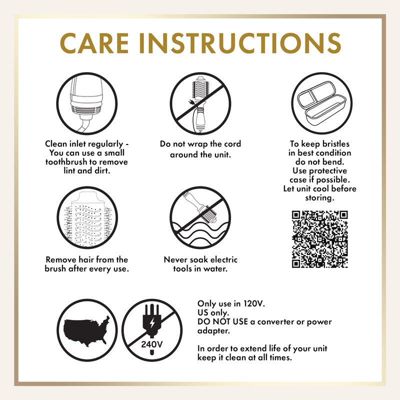 - CARE FOR YOUR VOLUMIZER: Clean air inlet regularly, remove hair from the brush after every use and do not wrap cord around the unit. To keep bristles in best condition let unit cool before storing