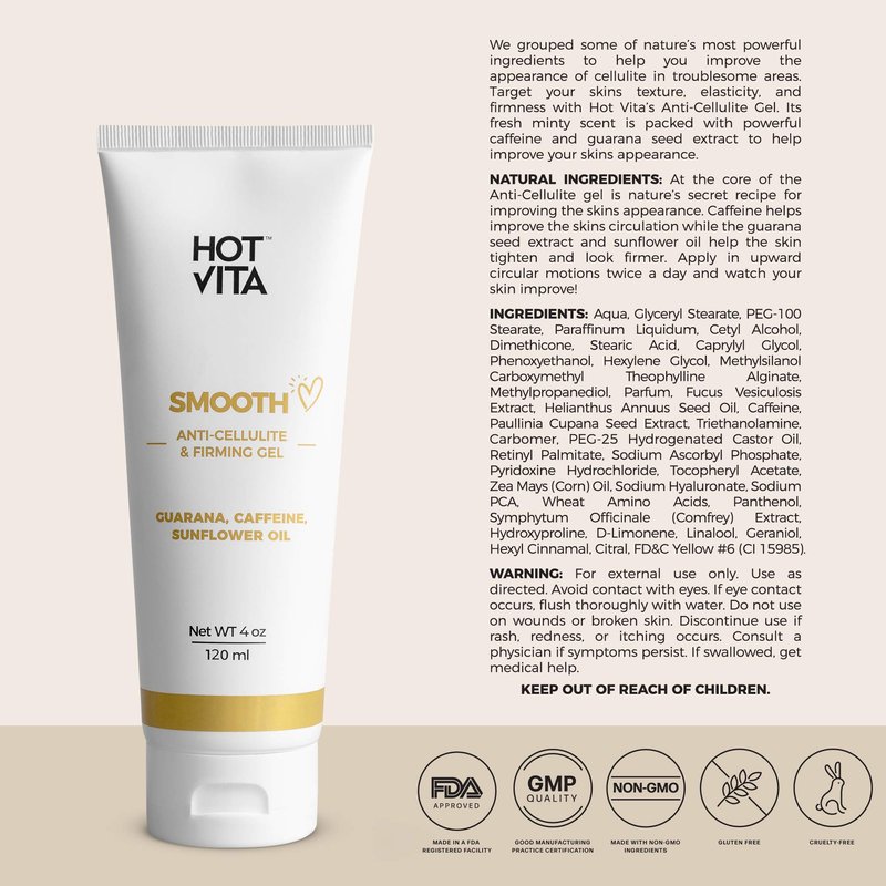 - HOT VITA PROMISE: Hot Vita set out to develop products that make the transition into a healthier lifestyle easier. If for any reason you don’t love your Hot Vita Anti-Cellulite Gel, just contact us and we’ll replace or refund your order.