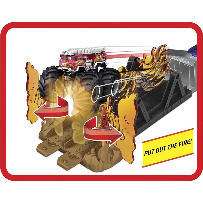 - Unlock kids' imagination and heroic storytelling with the Hot Wheels Monster Trucks Fire Through playset!