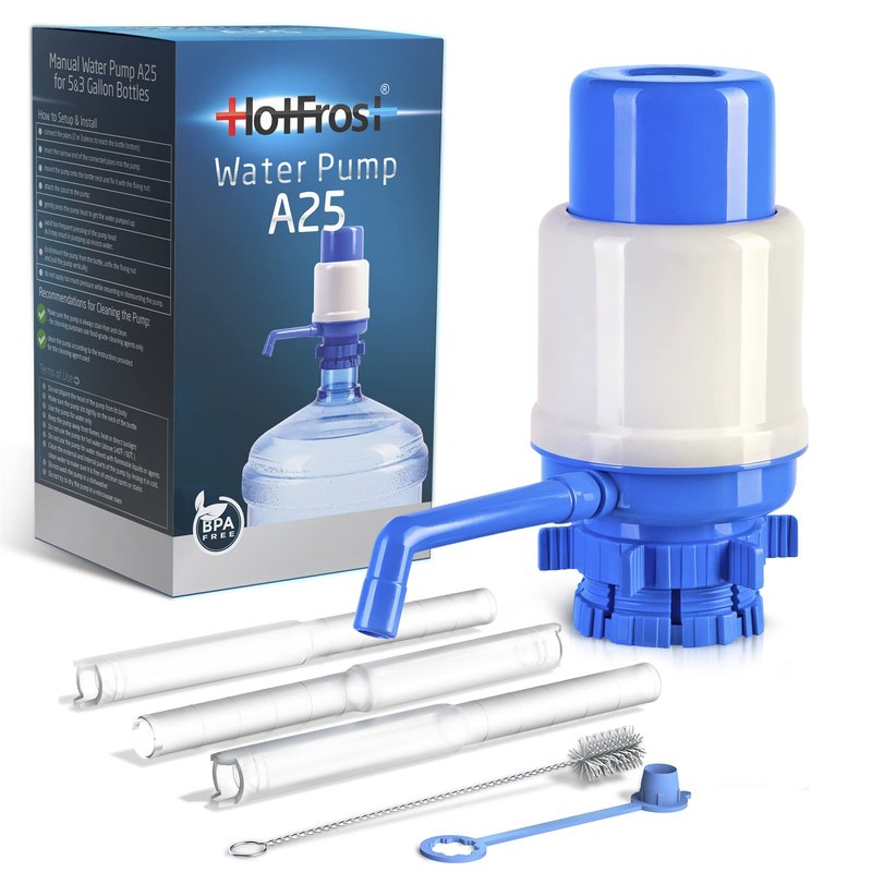 HotFrost Manual Water Pump for 5 Gallon Bottle – Secure Fit on Crown Top Jugs - Adjustable Tube Length, Protective Spout Cap, Cleaning Brush, BPA-Free Food-Grade Material – Water Pump for 5 Gallon Jug