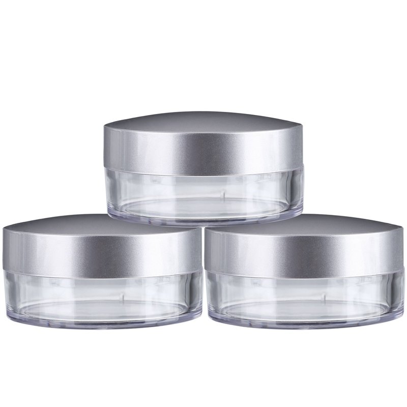 - 3 Pieces powder puff case: transparent and round plastic jar with separate, clear sifter seal to keep powder in place; 3 x Powder container with sifter and silver lids (puff excluded)