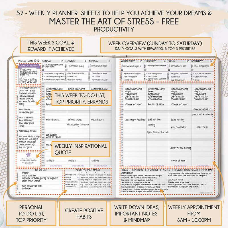 - 🏆 REDUCE OVERWHELM, STRESS AND FIX PROCRASTINATION - Follow a unique 8 step system that will help you bring back harmony, clarity, and peace in your life while achieving your goals. This planner 2024 is perfect for birthday gift, mother's day, anniversary gifts, and christmas gifts.