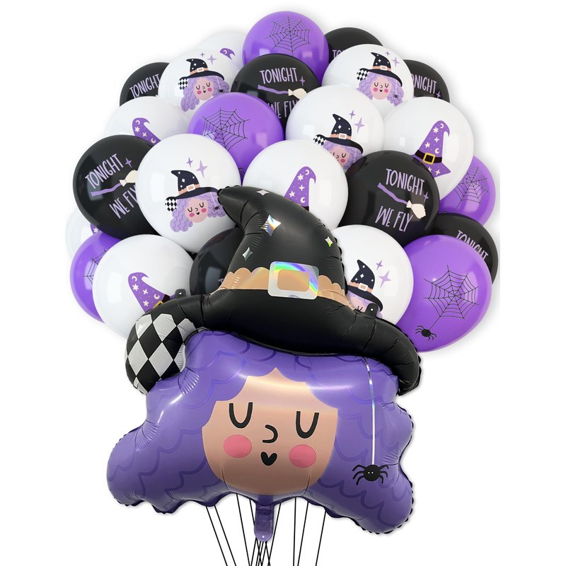- Creative Halloween Balloon Kit: Each set contains 50pcs 12" double sides print latex print balloons and 1pcs large witch foil balloon; 14pcs black balloons, 12pcs white balloons printed with the witch, 12pcs purple balloons printed with Spider web, and 12pcs balloons; Rich styles and Halloween main theme color will better decorate your Halloween home school and party.