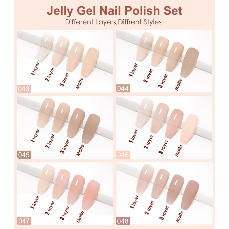 - 【𝐇𝐎𝐔𝐒𝐌𝐕 𝐉𝐞𝐥𝐥𝐲 𝐆𝐞𝐥 𝐍𝐚𝐢𝐥 𝐏𝐨𝐥𝐢𝐬𝐡 𝐒𝐞𝐭】:Experience the latest trend in nail fashion with our collection of 6 popular uv gel nail polish, featuring 6 bottles of Nude jelly gel nail colors. Unlike regular color gels, our jelly nude gel polish transforms your nails into a mesmerizing display of cherry blossom jelly-like effect. With each coat, the effect on your nails will vary,suitable for nail enthusiasts of all skin tones.