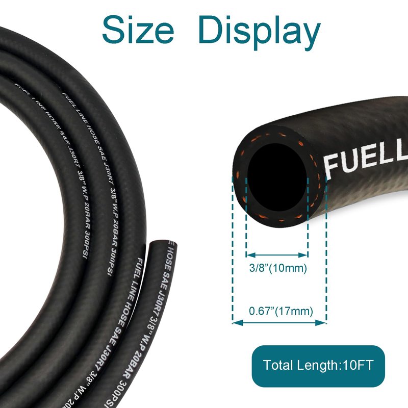 - FUEL HOSE SIZE: ID: 3/8" (10mm), OD: 0.67" (17mm), Length: 10FT.