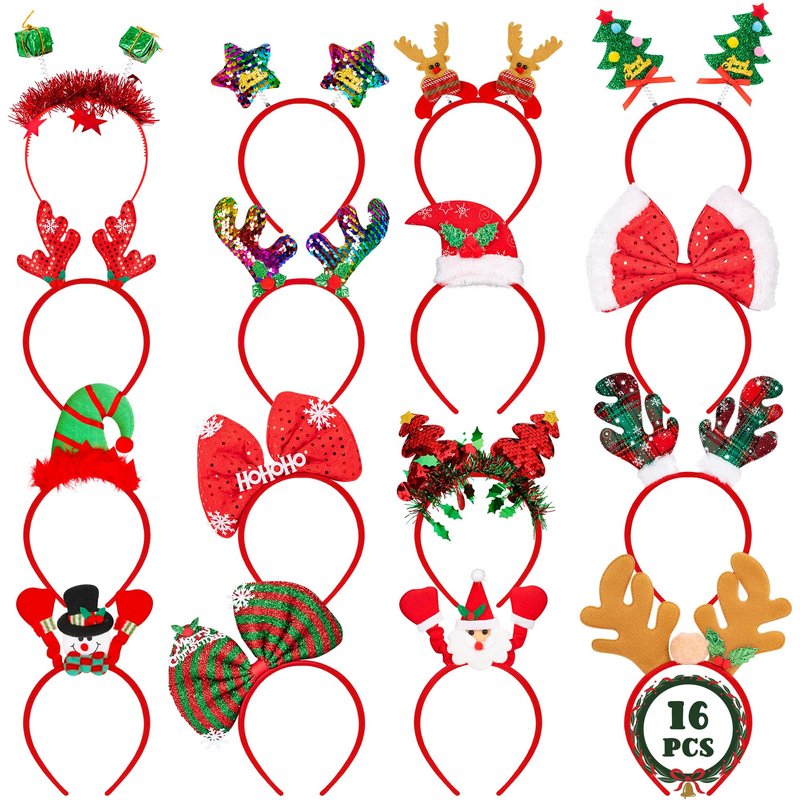 HOVACY 16 Packs Christmas Headbands, Cute Universal Christmas Toppers, Santa Hat, Reindeer Antlers, Snowman, Elf Hat, Bow Headwear for Adults Kids, Christmas Party Favors Holiday Supplies