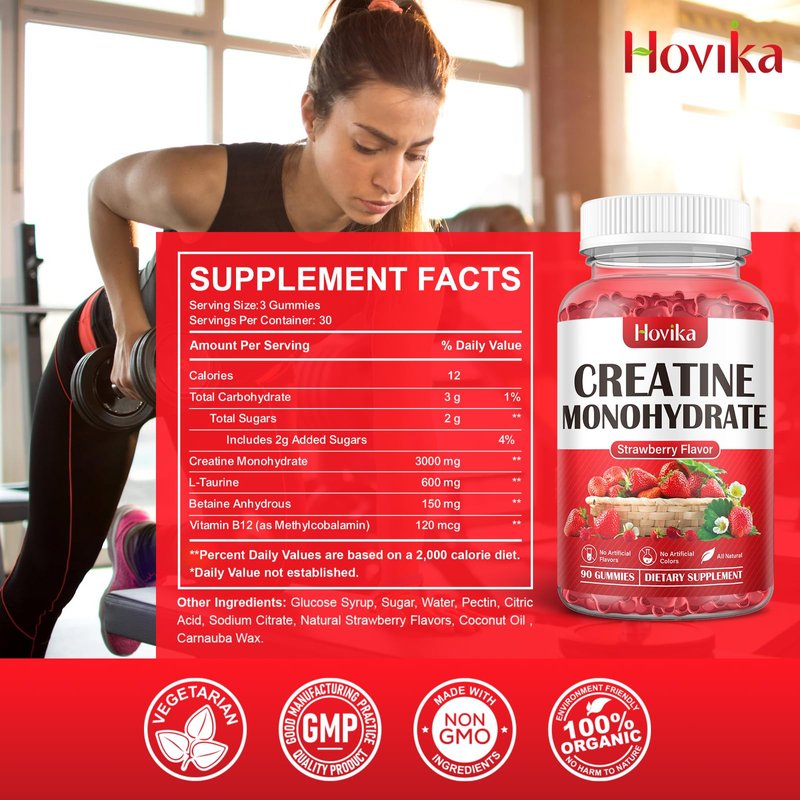 Hovika Creatine Monohydrate Gummies for Men & Women, Chewable 3g Creatine Monohydrate with Vitamin B12 for Muscle Growth & Recovery-Vegan, Natural Strawberry Flavor, 90 Gummies