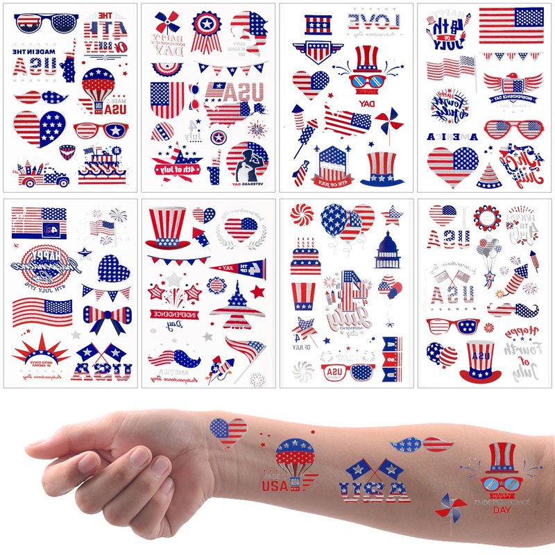 - 4th of July Glitter Temporary Tattoos Set: You will receive 8 sheets of 4th of July tattoos, 100+ pieces different USA flag tattoos design for you to choose, they are Silver Glitter, charming and creative USA tattoos stickers enough to share with your family and friends!