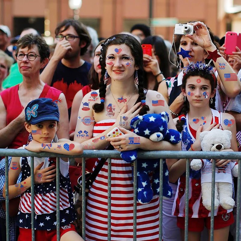 - Charming and Great Accessories for 4th of July: Apply this 4th of July temporary tattoos on your chest, face, shoulder, waist, sleeve, back, leg, arm, chest, hand, feet, neck and any other part of your body o show your love to the USA and increase the patriotic atmosphere, You'll be the center of attention in the Patriotic Day parade crowd!