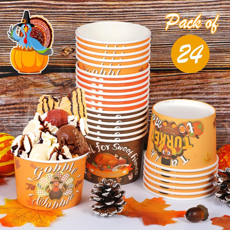 HOWAF 24pcs Friendsgiving Party Treat Snack Cups, Turkey Day Party Disposable Paper Cup Dessert Ice Cream Bowls for Thanksgiving Party Supplies, Friends Thanksgiving Day Ice Cream Cups