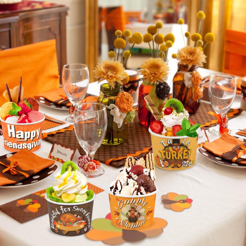 - Paper Material: Our Friendsgiving Party treat cups are made with BPA-Free food grade strengthened paper making them a great fit for ice cream, frozen yogurt, parfaits, snacks, and more! Hot or cold, our cups will take care of your frozen treats or hot soup, chili, and more. interior of the paper ice cream cups for Thanksgiving party supplies are features a leak-resistant coating to prevent unwanted mess and spillage!
