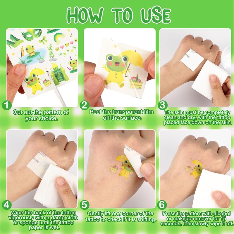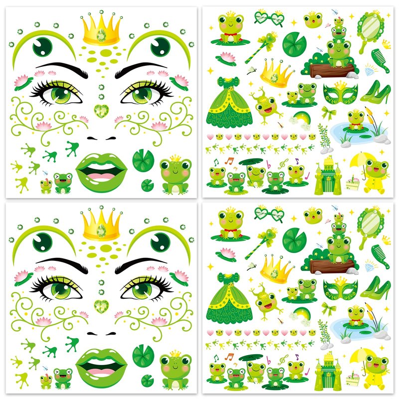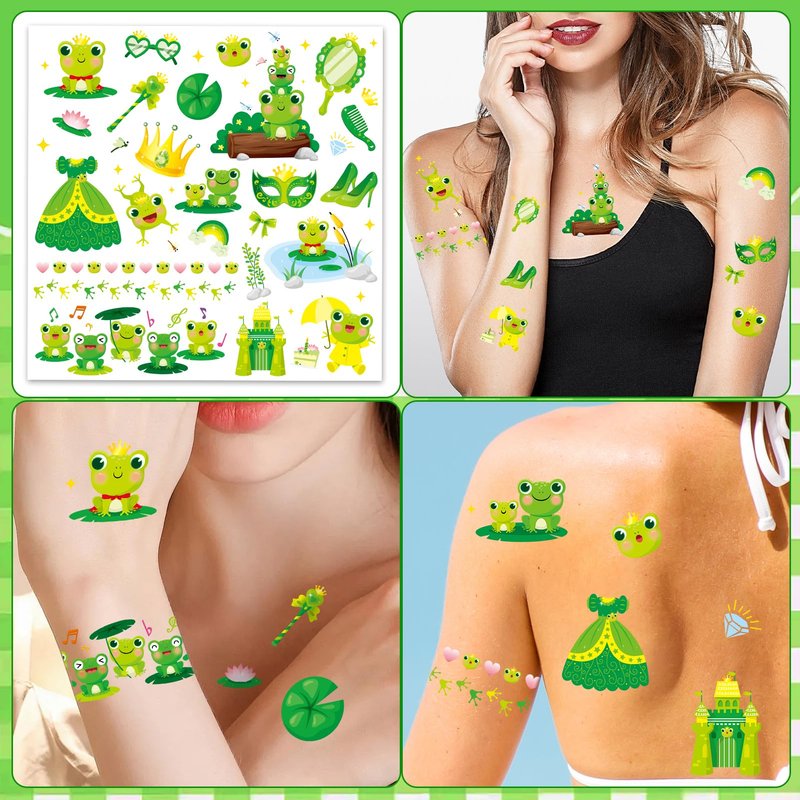 - Princess Frog Tattoos: You will get 2 sheets Princess Frog Face Tattoo + 2 sheets Princess Frog Temporary Tattoos for Kids Adults, in 2 different designs. Our Princess Frog Tattoos are most suitable for festival, Halloween.