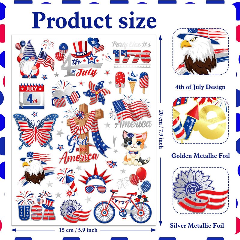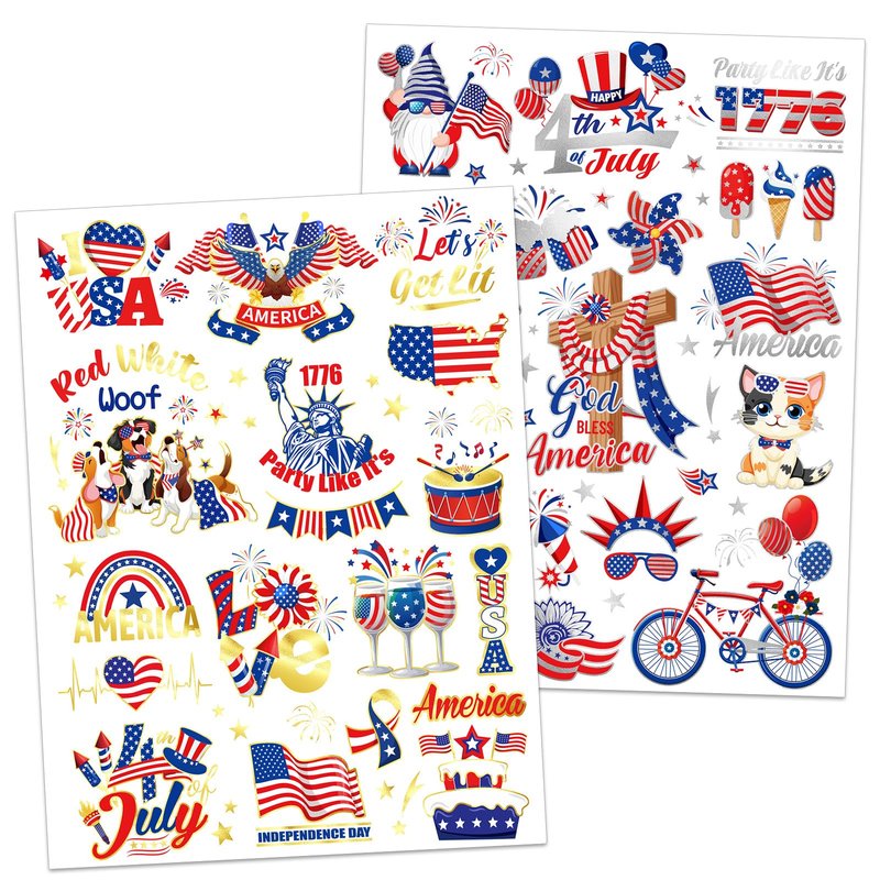 - Festive 4th of July Gold Silver Metallic Foil Temporary Tattoos: Happy 4th of July! Have a wonderful and patriotic America Day! May your USA Independence Day be filled with joy and festivities by applying our SHINE and GLITTER forth of July Decorations Tattoos to have a USA patriotic look! You will receive 2 large sheets Fourth of July red, white, blue + gold and silver tattoos in different designs! USA flag star and stripe and Independence day 4th of July temporary tattoos are very suitable for sharing with friends!