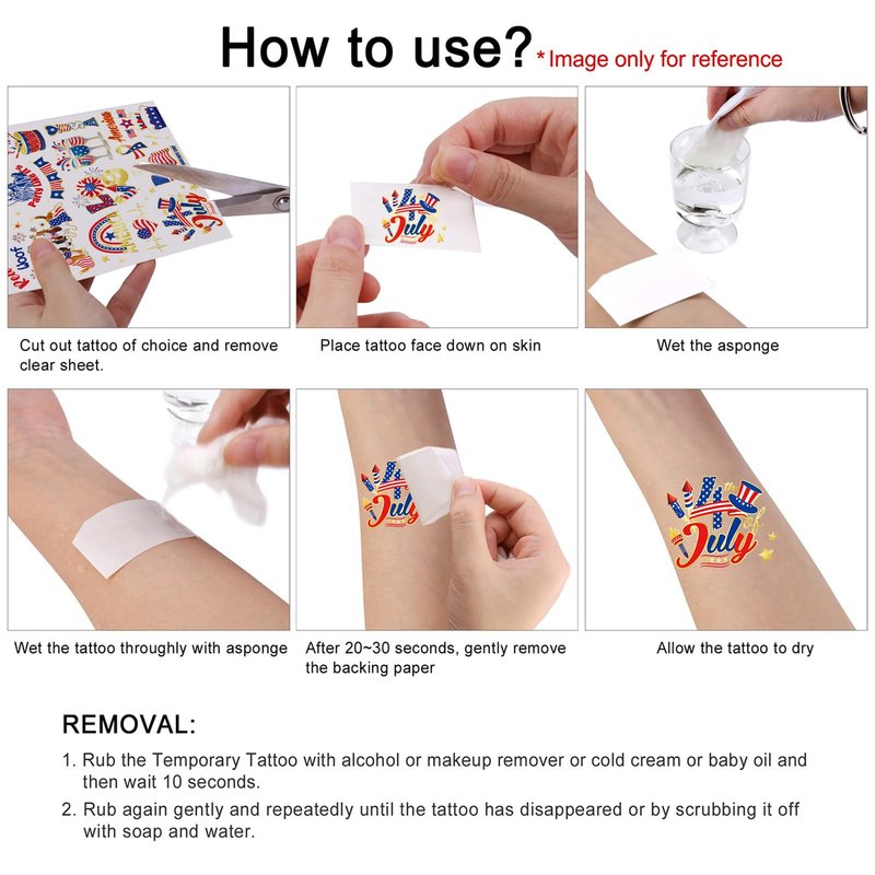 - Easy To Apply And Remove: 4th of July Party tattoos can be applied on your chest, face, shoulder, waist, sleeve, back, leg, arm, chest, hand, feet, neck and any other part of your body to show your love to the USA and increase the patriotic atmosphere, You'll be the center of attention in the Patriotic Day parade crowd! Fourth of July fake tattoos can be easily removed with baby oil, alcohol, olive oil, you can change the patterns you like.