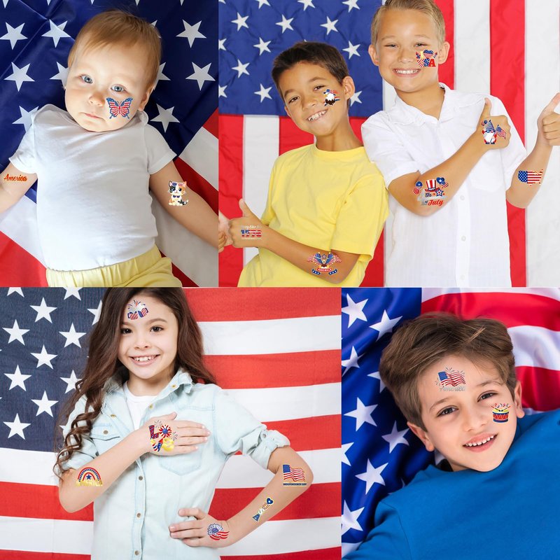- Wide Application: These 4th of July face tattoos, America flag tattoo stickers perfect for celebrating Independence Day, independence day temporary tattoos for patriotic themed party supplies are popular gift for kids! Not only perfect for 4th of July, Memorial Day, Independence Day parades, President's Day, veteran homecoming party and other patriotic celebration events, but also suitable for family gatherings, costume parties, birthday parties!