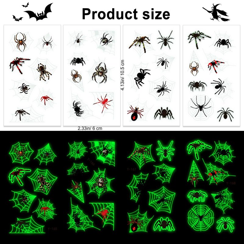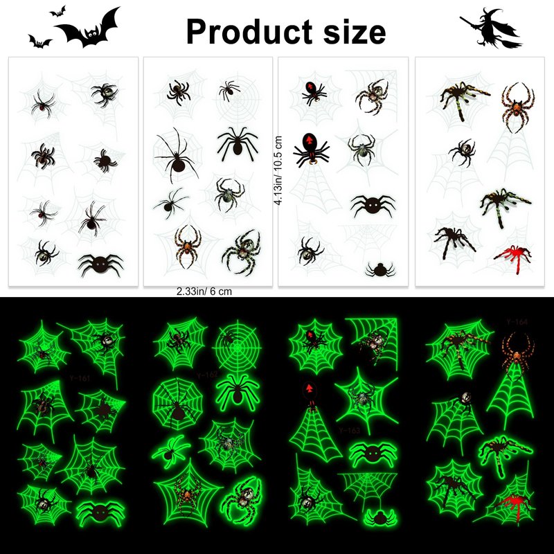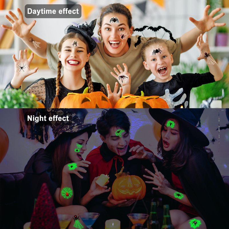 - Halloween Temporary Tattoos Stickers Include: You will receive 10 sheets Halloween Spider theme tattoos stickers with different patterns. Glow in the dark Happy Halloween temporary Tattoos will need a few minutes of activation by light before they will glow in the dark.