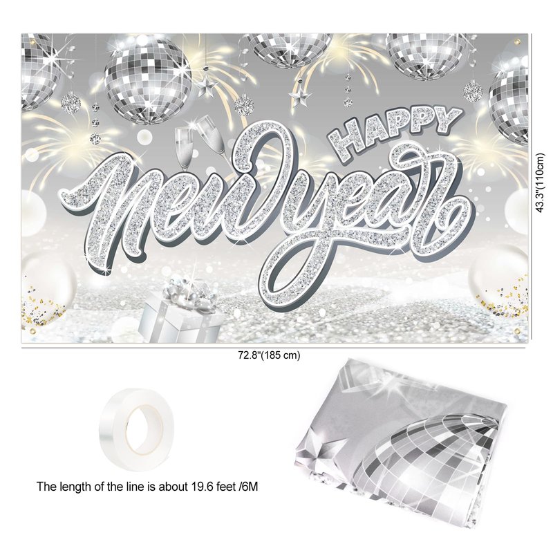 Silver New Year Backdrop Banner measures 185×110 cm/72.8×43.3 inches