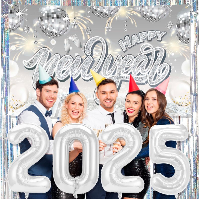 - 【Unique Silver New Years Eve Decorations】1*Glitter silver Happy New Year backdrop banner 2* laser silver Foil Fringe Curtain, 1* silver 2025 foil balloons, perfect as new year party photo background, come along with a 6m long ribbon, easy to hang on through the copper grommet! Happy New Year 2025 decorations banner can be hang on home, office, garden tree branch or front door as welcome sign, convenient to decorate a festive new year party, perfect new year decoration accessories!