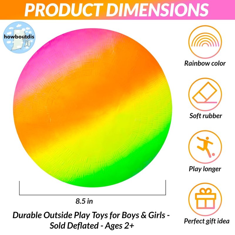 HOWBOUTDIS 8.5 inch Rainbow Playground Ball for Kids - Bouncy 8.5 inch Rubber Ball - Four Square - Kickball - Beach Fun - Durable Outside Play Toys for Boys & Girls - Sold Deflated - Ages 2+