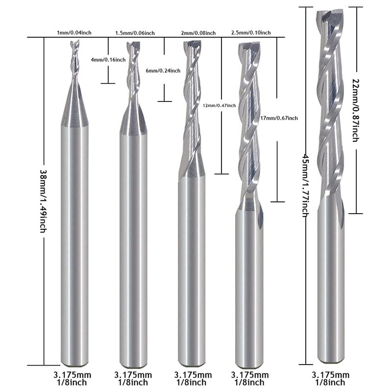 HOZLY CNC Router Bits Set 1/8" Shank CNC Bit End Mill Flat Nose Carbide Endmill Two Flute Spiral Upcut Milling Cutter Tool Set (CED :1mm 1.5mm 2.0mm 2.5mm 3.175mm) for Wood PVC MDF Hardwood