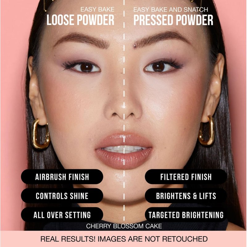 Elevate your beauty routine with Huda Beauty's Easy Bake and Snatch Pressed Talc-Free Brightening and Setting Powder in the enchanting shade Cherry Blossom, specially curated for fair to medium skin tones with true pink undertones. This creamy and hydrating non-comedogenic pressed powder offers medium coverage and a natural finish, effortlessly brightening and setting your makeup. Infused with key ingredients such as hyaluronic acid for a smooth, non-drying texture and an avocado derivative to control shine, this fragrance-free and talc-free formula delivers a flawless, lifted look without any flashback. The compact is equipped with a precision-designed sponge, perfect for targeted setting and convenient on-the-go touch-ups. Unveil a radiant complexion with this indulgent powder that combines skincare benefits with makeup artistry.