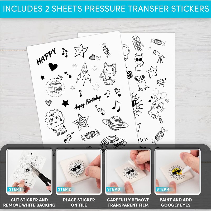 - 【More Decorations Than the Competition! - 109 Crafting Accessories】Our DIY craft kit for kids (8+yrs) includes everything children need to make beautiful magnetic tiles, exactly as pictured: 8 Ceramic Tiles, 8 Adhesive Magnets, 6 Acrylic Markers, 8 Stencils, 77 Water Transfer Stickers and 10 Googly Eye Stickers. Each tile is 2”*2", making them the perfect size for little fingers to decorate! Our kits are great for boys and girls alike and are 100% child safe.