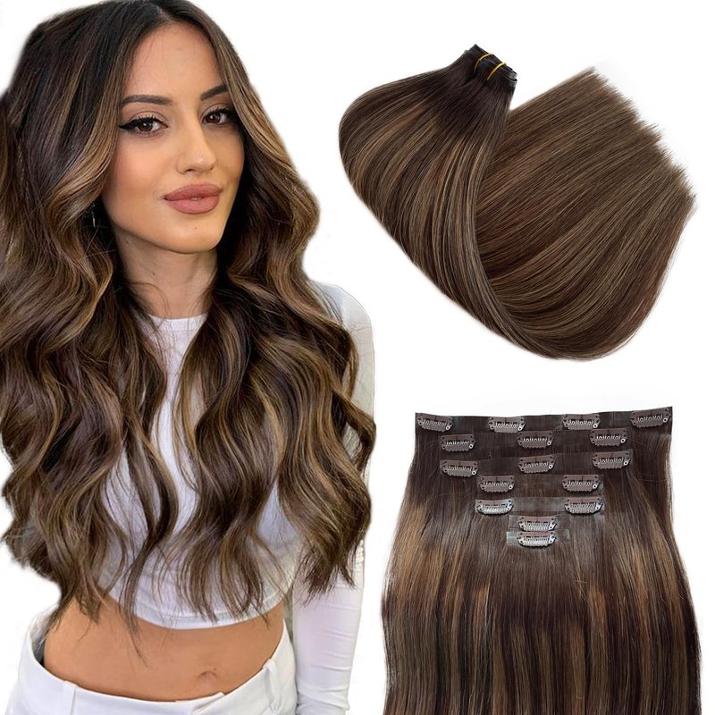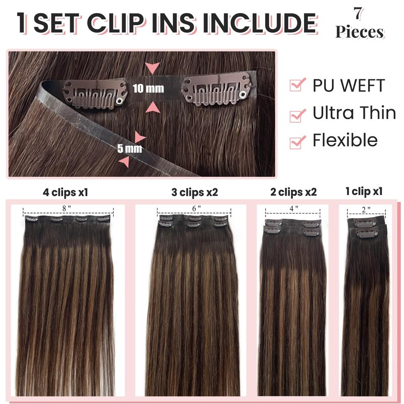 - 【Human Hair Clip in Extensions 7PC 100G】Balayage Dark Brown Mixed Ash Brown. Valiilo clip in hair extensions are made with a thin silicone-weft base that lays flat against your head and lets you feel more comfortable. Valiilo clip in hair extensions available in 6 lengths: 12'', 14", 16", 18", 20", 22", 7pcs a set with different widths. Usually 1 pack can be used for adding volume, 2-3 packs are recommended if prefer thick hair.