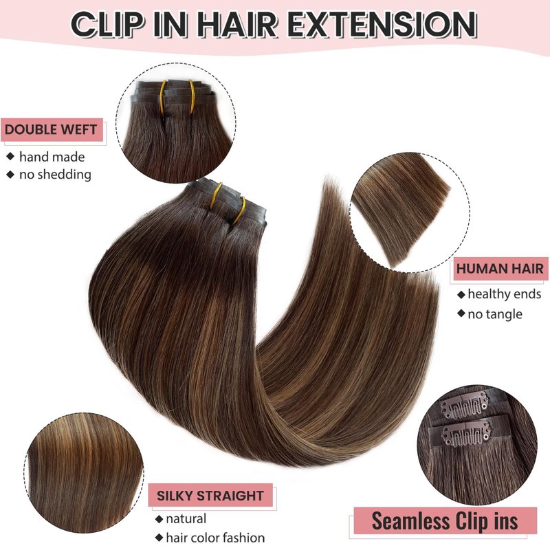 Human Hair Clip in Extensions Ombre Brown Highlights 16 Inch 7 Pcs Seamless Clip in Hair Extensions Real Human Hair Double PU Weft Natural Silky Clip on Straight Hair 100G