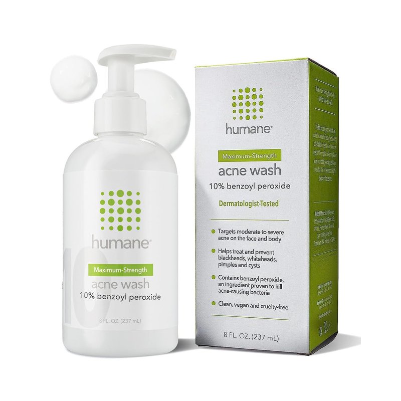 - Maximum-Strength Acne Treatment Wash: Formulated with 10% benzoyl peroxide, Humane Maximum- Strength Acne Wash is a potent face and body cleansing treatment that targets the primary cause of acne growth and combats excessive oil production. Helps to unclog pores and clear skin. Dermatologist-tested. 8 FL. OZ. bottle